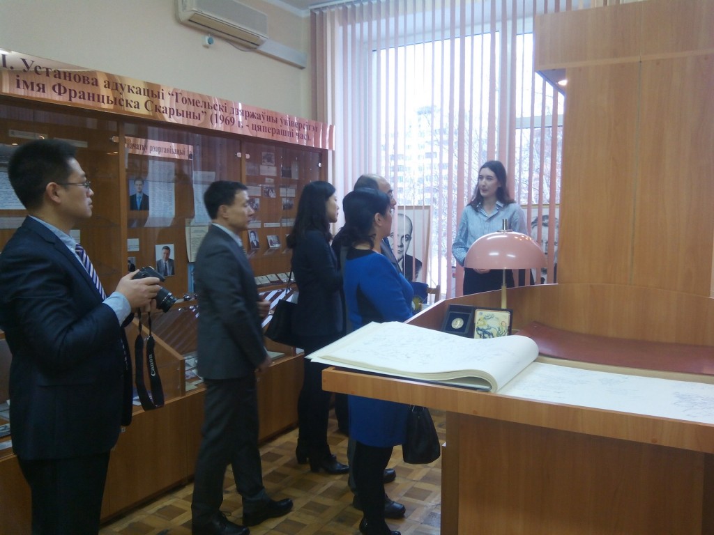 19 декабря 2017 г. ГГУ им. Ф. Скорины посетила делегация Нанкинского университета (Китай). Для высоких гостей студентка 3 курса специальности «Музейное дело и охрана историко-культурного наследия» кафедры истории Беларуси Скидан Мария провела экскурсию в «Музее-лаборатории Ф. Скорины». Мария рассказала об истории и перспективах развития нашего университета, обратила внимание на многолетние связи и плодотворное сотрудничество с научными и образовательными центрами Китая. Гости проявили живой, неподдельный интерес и оставили запись в памятной книге музея.