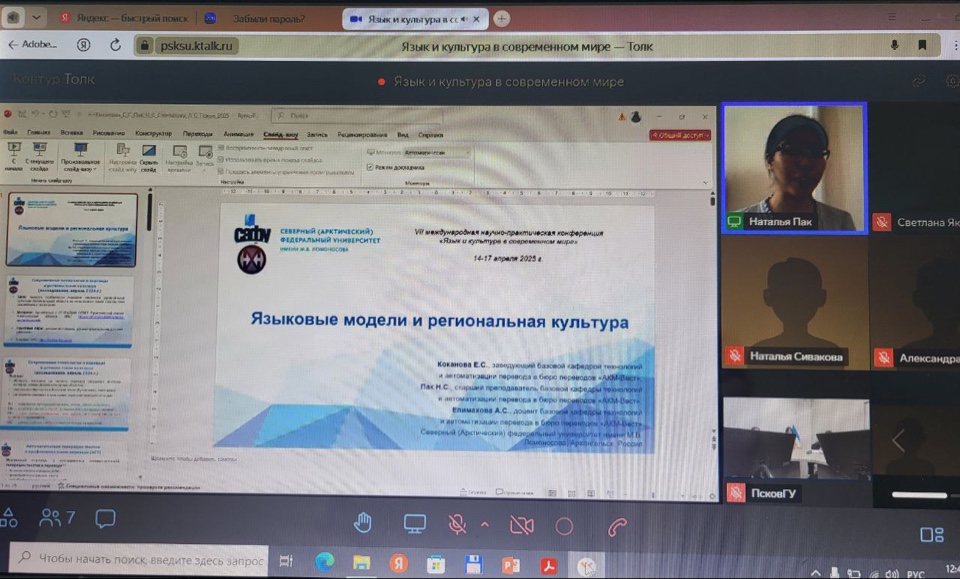 Сегодня 14 апреля заведующий кафедры межкультурных коммуникаций и международного туризма Сивакова Н.А. приняла участие в VII международной научно-практической конференции, организованной Псковским государственным университетом. На заседании секции «Глобализация и идентичность. Мировые и национальные языки: перспективы их развития, роль в современном обществе. Взаимоотношение языка и культуры» Сивакова Н.А. выступила онлайн с докладом «Социальная реклама как отражение аксиологической системы общества».