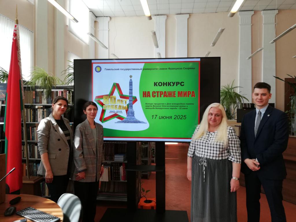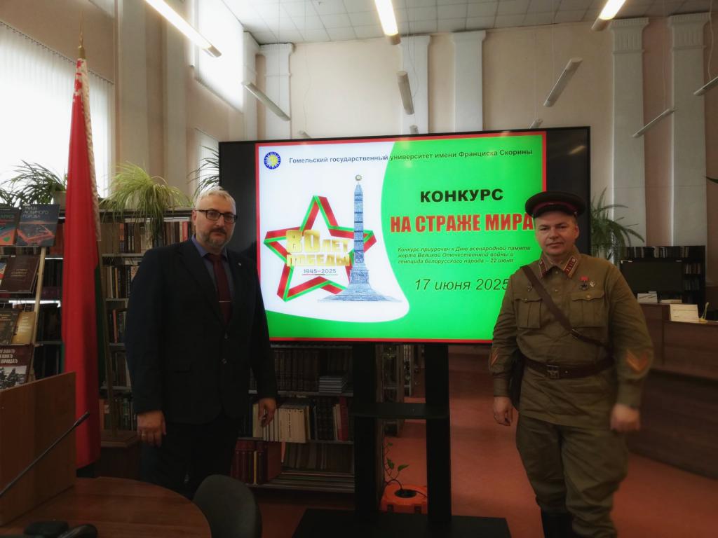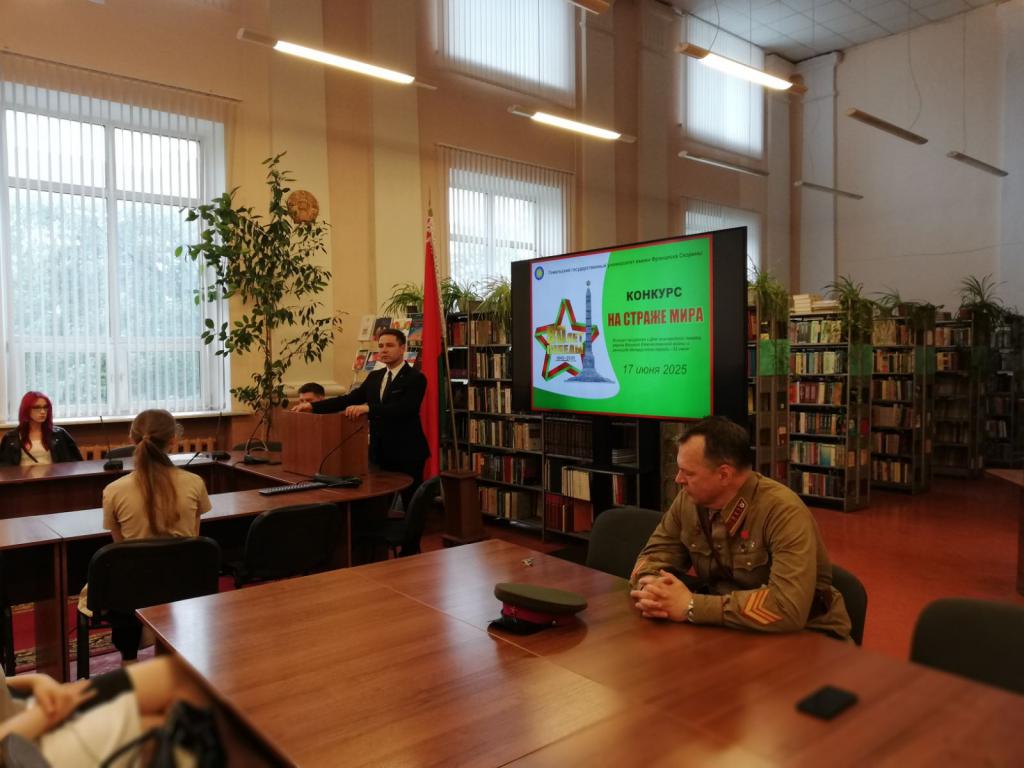 17 июня 2025 года состоялся первый университетский конкурс «На страже мира», приуроченный к Дню всенародной памяти жертв Великой Отечественной войны и геноцида белорусского народа – 22 июня. Его организатором стала кафедра истории Беларуси. На торжественном открытии с приветственным словом выступил проректор по идеологической и воспитательной работе Д. А. Ходанович и проректор по безопасности, режиму и кадрам А. М. Куксо. Декан факультета истории и межкультурных коммуникаций С. А. Черепко напомнил присутствовавшим об исторических фактах, свидетельствующих о трагической судьбе белорусского народа, заведующий кафедрой истории Беларуси О. Г. Ященко обратила внимание на важность уважительного отношения к подвигу предшествующих поколений, необходимость защиты правды о войне и сохранения мира.