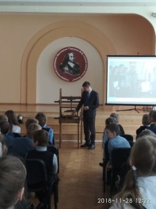 2. 28 ноября в гимназии №46 была проведена профориентационная работа, совмещенная с уроком «живой истории», организованная преподавателем Шиляевым А.П. В ходе мероприятия школьники смогли узнать об истории нашего факультета и кафедры, планах набора и возможности трудоустройства, студенческих организациях, в том числе и СНИЛ «Белы Крыж», а также им была продемонстрирована работа печатного станка времен Ф. Скорины.