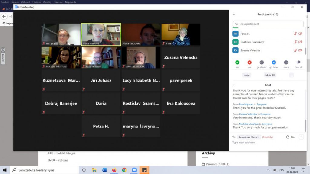 В рамках налаживания сотрудничества с гуманитарным факультетом Карлова университета в городе Прага по приглашению чешских коллег 8 декабря 2020 г. Елена Дубровко, доцент кафедры всеобщей истории прочла гостевую лекцию . Лекция была проведена с использованием возможностей программы для организации видеоконференций Zoom в рамках семинара по исторической социологии, организованного кафедрой исторических исследований Карлова университета. Целью данного семинара является ознакомление с основными направлениями, концепциями и методами исследований, проводимых участниками программы. На семинары также приглашаются гости c других факультетов или университетов, в том числе из-за рубежа. Помимо сосредоточения внимания на предметах исследования, особое внимание уделяется вопросам методологии во время презентаций и дебатов.