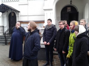 Студенты I курса исторического факультета гомельского университета им. Ф. Скорины вместе с доцентом кафедры всеобщей истории Кротовым Андреем Михайловичем посетили Свято-Никольский мужской монастырь в г.Гомеле 1 декабря 2017г. Архимандрит Савва (Мажуко) провел для ребят экскурсию по обители, после которой вместе с наместником монастыря архимандритом Амвросием (Шевцовым) ответили на вопросы молодых людей. Их интересовало как происходит причисление человека к лику святых и существует ли обратная процедура? Как административно устроена епархия? Что такое каноны и почему они устанавливаются? Необходимы ли в отношениях между церковью и государством посредники? Почему наше общество не такое активное, как в других странах? Какую миссионерскую и социальную работу проводит монастырь?