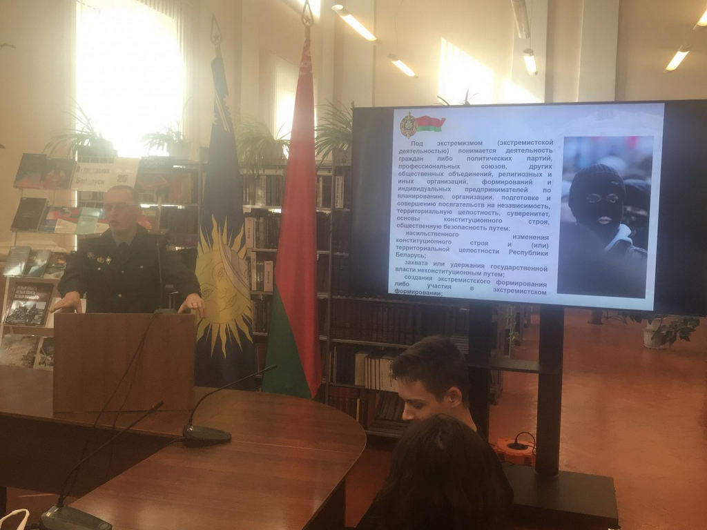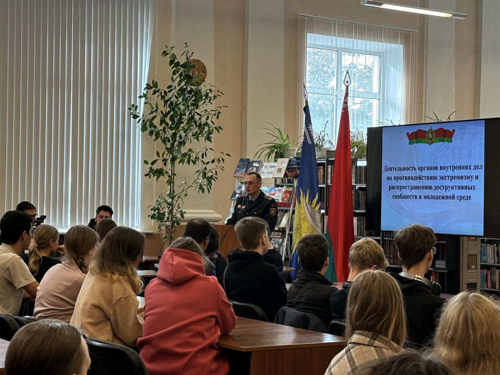 Со студентами 1 курса факультета истории и межкультурных коммуникаций и факультета математики и технологий программирования воспитательную информационную беседу провел Новиков Денис Сергеевич, старший инспектор отдела идеологии УВД Гомельского облисполкома, подполковник.