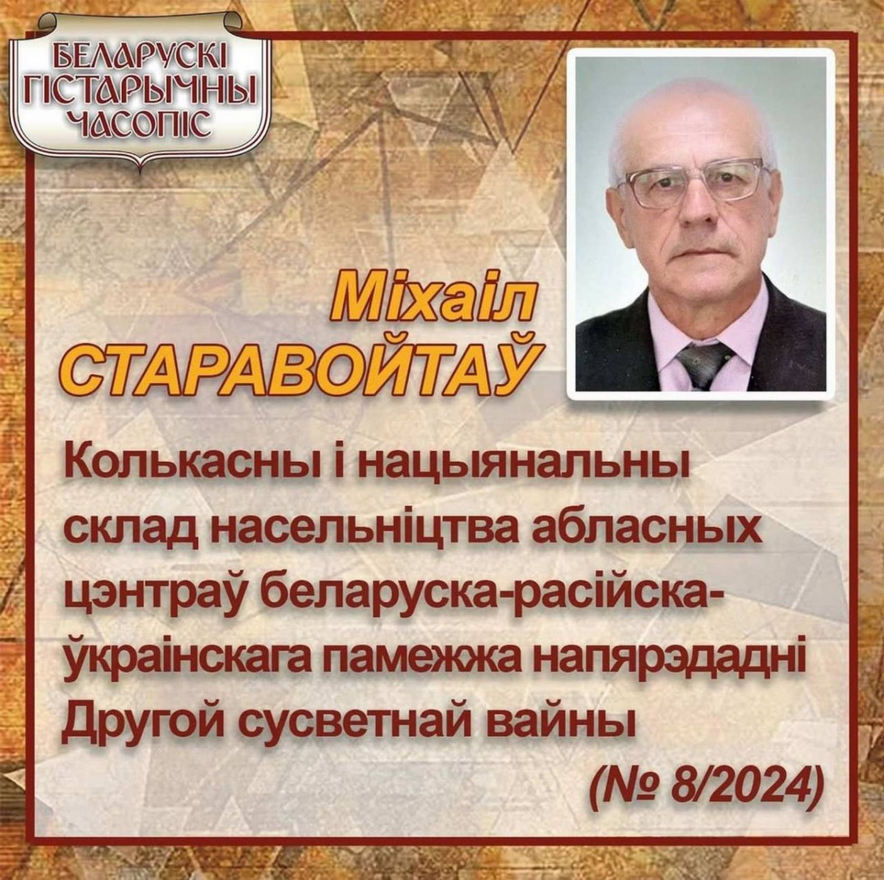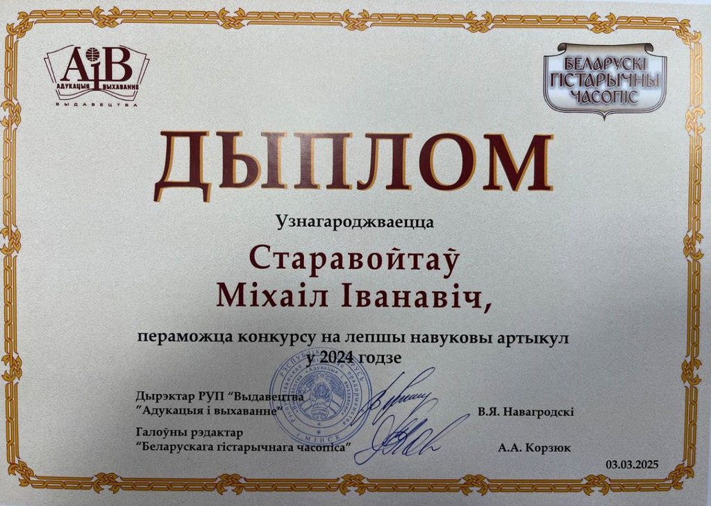Доцент кафедры истории Беларуси Старовойтов Михаил Иванович стал победителем конкурса на лучшую научную статью объявленного редакцией "Беларускага гістарычнага часопіса" в рамках проходившего Года качества Республики Беларусь. Поздравляем победителя с заслуженной наградой и желаем дальнейших научных достижений!