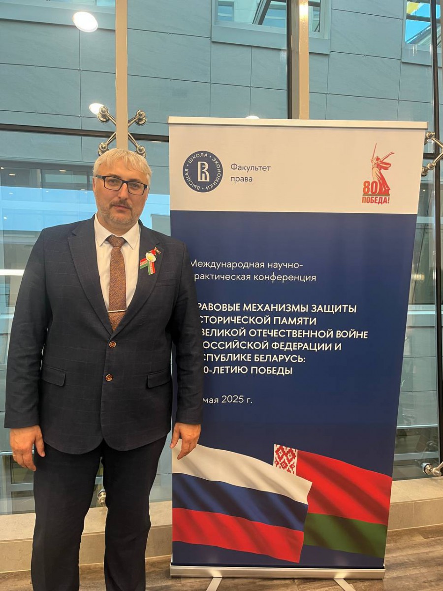 14 мая на факультете права Высшей школы экономики (Москва, Россия) состоялась Международная научно-практическая конференция «Правовые механизмы защиты исторической памяти о Великой Отечественной войне в Российской Федерации и Республике Беларусь: к 80-летию Победы». Конференция была приурочена к юбилею Победы в Великой Отечественной войне и посвящена обсуждению современных подходов к правовой защите исторической памяти, противодействию её фальсификации, а также укреплению национальной идентичности в условиях глобальных вызовов. ГГУ имени Ф. Скорины представил декан факультета истории и межкультурных коммуникаций Станислав Черепко.