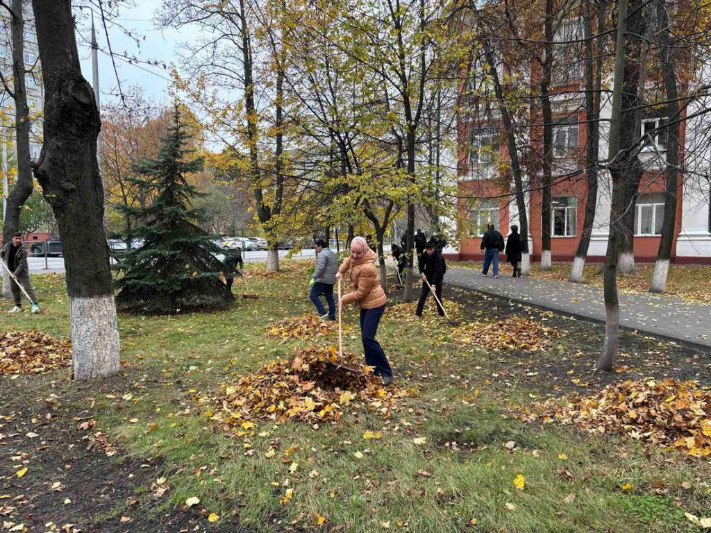 Очень активно, энергично, с настроением студенты убирали листву около корпуса 2 университета и между учебными корпусами 2 и 3. В работах также принимали участие сотрудники службы АХЧ.