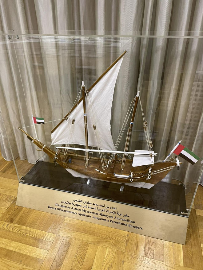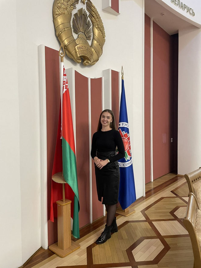 В апреле 2024 года я приняла участие в конкурсе Министерства иностранных дел «Хочу быть дипломатом». Конкурс был приурочен к 105-летнему юбилею современной белорусской дипломатической службы. В конкурсе принимали участие более 100 студентов белорусских ВУЗов, которые интересуются международными отношениями, внешней политикой и экономикой. Мне выпал уникальный случай побывать в Министерстве иностранных дел и увидеть где проходят важные переговоры с делегациями других стран и прочувствовать масштабы происходящих переговоров. Много интересного и запоминающегося. Очень запомнился музей артефактов, связанных с дипломатической службой министров. Один из интересных «сувениров»- это деревянный корабль с мачтами - подарок от посла Объединенных Арабских Эмиратов.